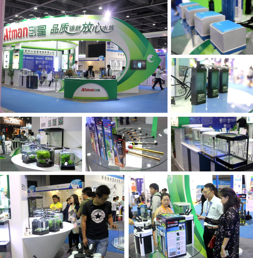 我们把本次参展看作是2015年产品研发的阅兵场,展会上秀出了以“微水族”为概念的新一代配套式鱼缸,新研发的节能水泵,气泵(气立方),新型加热棒(猛将,金刚),新升级的AT缸外生化过滤桶系列等等。